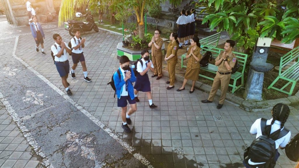 Setibanya di sekolah, seluruh murid dan guru secara individu melaksanakan persembahyangan di pelinggih yang tersebar di area sekolah. Dengan khusyuk, doa dipanjatkan sebagai wujud rasa syukur dan memohon tuntunan agar aktivitas belajar hari ini berjalan lancar dan penuh makna ![]()