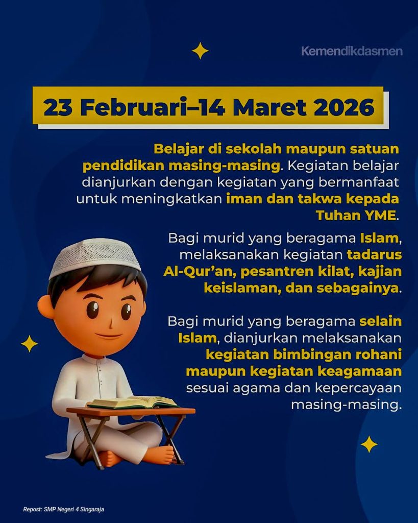 #SahabatSpenpraja, menjelang bulan suci Ramadan 1447 H, Mendikdasmen, Menteri @kemenag_ri, dan Menteri @kemendagri telah menerbitkan Surat Edaran Bersama (SEB) tentang Jadwal Belajar selama Ramadan 1447 H/2026 M yang ditetapkan pada 13 Februari 2026.